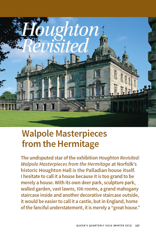 The undisputed star of the exhibition Houghton Revisited: Walpole Masterpieces from the Hermitage at Norfolk’s historic Houghton Hall is the Palladian house itself. I hesitate to call it a house because it is too grand to be merely a house. With its own deer park, sculpture park, walled garden, vast lawns, 217 rooms, a grand mahogany staircase inside and another decorative staircase outside, it would be easier to call it a castle, but in England, home of the fanciful understatement, it is merely a “great house.”